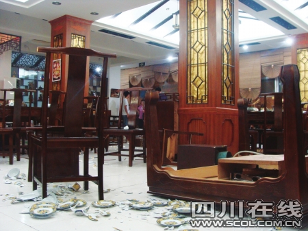 洪雅縣招商局局長冷國民,帶著10余位親朋好友,也在該店“青衣江”包間內(nèi)用餐。飯后結(jié)賬時(shí),冷國民一行與收銀員在簽單上出現(xiàn)分歧,隨之發(fā)生口角。當(dāng)冷國民讓司機(jī)現(xiàn)金結(jié)清賬單后,其所帶男性客人在趕來“救場”的3名男子的帶領(lǐng)下,砸爛店內(nèi)桌椅、碗碟等,打傷兩名店員。