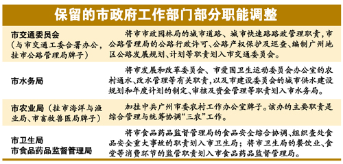 此輪改革中涉及調(diào)整、撤并的機(jī)構(gòu)共有29個。調(diào)整后,廣州市政府工作部門和辦事機(jī)構(gòu)從49個精簡為40個。此外,設(shè)部門管理機(jī)構(gòu)2個:廣州市勞動教養(yǎng)工作管理局和廣州市城市管理綜合執(zhí)法局,F(xiàn)有的市政府派出機(jī)構(gòu)將保留4個撤銷1個。
