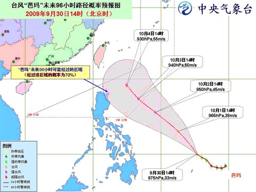 中新網(wǎng)9月30日電 據(jù)中國(guó)氣象局網(wǎng)站消息,今年第17號(hào)強(qiáng)熱帶風(fēng)暴“芭瑪”于30日下午在菲律賓以東洋面加強(qiáng)為臺(tái)風(fēng),30日17時(shí)其中心位于菲律賓馬尼拉東南方大約1560公里的洋面上,就是北緯10.3度、東經(jīng)134.7度,中心附近最大風(fēng)力有12級(jí)(35米/秒),中心最低氣壓為970百帕。