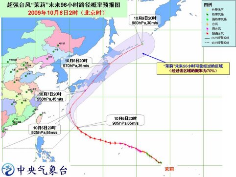 另外,今年第18號(hào)超強(qiáng)臺(tái)風(fēng)“茉莉”的中心6日2時(shí)位于日本沖繩島那霸東南方大約750公里的西北太平洋洋面上,就是北緯21.1度、東經(jīng)132.5度,中心附近最大風(fēng)力仍有17級(jí)以上(65米/秒),中心最低氣壓為905百帕。