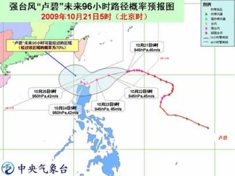 “盧碧”的中心21日5時位于菲律賓馬尼拉東北方大約940公里的西北太平洋洋面上,就是北緯20.4度、東經(jīng)127.6度,中心附近最大風力有14級(45米/秒)。