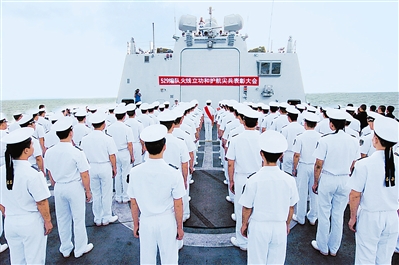 綬帶映紅碧波,掌聲響徹大洋。今天(當(dāng)?shù)貢r(shí)間11月25日)下午4時(shí),中國(guó)海軍第三批護(hù)航編隊(duì)“火線立功和護(hù)航尖兵表彰大會(huì)”在“舟山”艦飛行甲板舉行。