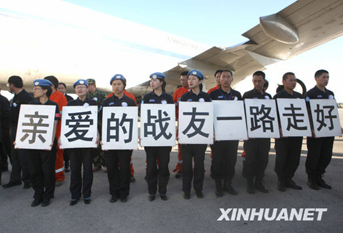 一切安排停當(dāng),人群自發(fā)聚攏過來,列隊送行。隊員們手中托著“親愛的戰(zhàn)友一路走好”的牌子,表情凝重,注視著飛機(jī)在跑道上緩緩滑行。
