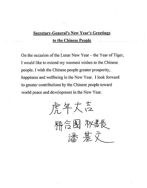 潘基文在用英文發(fā)表的賀詞中說:“值此農(nóng)歷新年‘虎年’到來之際,我謹(jǐn)向中國(guó)人民致以最熱烈的祝賀。祝愿中國(guó)人民在新的一年里更加幸福安康。我期待著中國(guó)人民在新的一年里為世界和平與發(fā)展作出更大貢獻(xiàn)!
