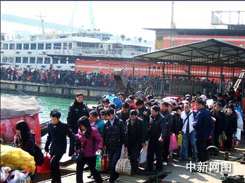 2月20日,一連寂靜數(shù)日的宜昌港口迎來節(jié)后首次農(nóng)民工出行高峰,19艘客船共10156人直接通過三峽、葛洲壩兩個船閘下行抵達(dá)了宜昌港。據(jù)宜昌港負(fù)責(zé)人介紹,當(dāng)天共有37艘普通客船、18艘高速客船出川,創(chuàng)下今年春運以來日出川客流量最高峰。除19艘客船直接抵達(dá)了宜昌港外,還有36艘客船未過三峽船閘,直接駛?cè)肓巳龒{壩首的太平溪港和茅坪港,出川農(nóng)民工下船后再乘轉(zhuǎn)運客車通過三峽專用公路抵達(dá)宜昌分流。