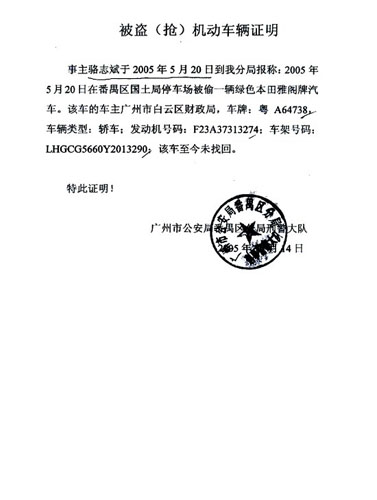 該博文還附了幾張文件的掃描圖作為證明。一張成交日期剛好是2005年5月20日的由番禺區(qū)國(guó)土房管局開出的《契稅完稅證》,納稅人為“駱×”,房地產(chǎn)位置為錦繡香江花園××園×街×號(hào);一張六天后廣州市國(guó)土房管局開出的同處房產(chǎn)的《房地產(chǎn)權(quán)情況證明》,權(quán)屬人為“駱×”,但備注注明共有人為韓××及駱志斌;一張廣州市公安局番禺分局刑警大隊(duì)開出的《被盜(搶)機(jī)動(dòng)車輛證明》(見左圖),上寫駱志斌于2005年5月20日到該分局報(bào)案稱,本田雅閣汽車當(dāng)天在番禺區(qū)國(guó)土局停車場(chǎng)被盜。網(wǎng)友注明,“駱×”為駱志斌的公子。另外,網(wǎng)友還附了一張房產(chǎn)圖片,稱錦繡香江花園同樣位置的別墅在2006年已賣到每平方米3萬(wàn)元。