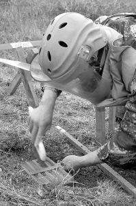 筆者在現(xiàn)場看到,頭戴防護(hù)面罩、身穿厚厚的防護(hù)服的掃雷作業(yè)手,時(shí)而彎著腰用探雷器來回探測,用噴漆或小紅旗做好標(biāo)示,時(shí)而雙膝跪在地上用掃雷專用工具進(jìn)行挖掘,幾乎是以厘米的進(jìn)度向前推進(jìn)。