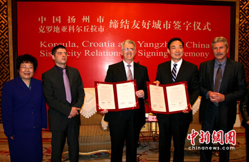 中新網(wǎng)揚州4月17日電(記者 崔佳明)16日,克羅地亞科爾丘拉市副市長弗蘭克•斯蒂奈克率團訪問揚州,當晚,揚州市副市長聞道才和弗蘭克•斯蒂奈克副市長在揚州迎賓館分別代表兩市簽訂協(xié)議,雙方正式締結為友好城市。