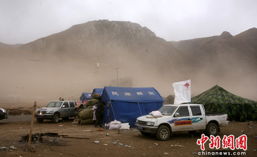 中新網青海玉樹4月19日電(記者劉忠俊)19日14:36分,青海玉樹地震災區(qū)天氣突變,由晴天轉變?yōu)殛幪,現場掛起了大風,天空撒起了雨點。