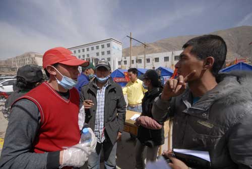 他的名字叫高樹友。在現(xiàn)場負(fù)責(zé)招募志愿者的玉樹團(tuán)州委干事扎西告訴我,地震發(fā)生后幾小時(shí),滿身是土的高樹友跑來了,找到我們要求當(dāng)志愿者!爱(dāng)時(shí)現(xiàn)場還很亂,我們隨便找了一張紙,高樹友寫下了第一個(gè)名字”,扎西從桌上拿出一個(gè)寫滿名字的紙說:“就是這樣的紙,現(xiàn)在已經(jīng)寫滿幾十頁,有400多人報(bào)名了,地震當(dāng)天有30多個(gè)。高樹友不僅是第一個(gè)報(bào)名,而且?guī)椭覀兘M織志愿者,這個(gè)招募點(diǎn)就是我們一起搭起來的。”