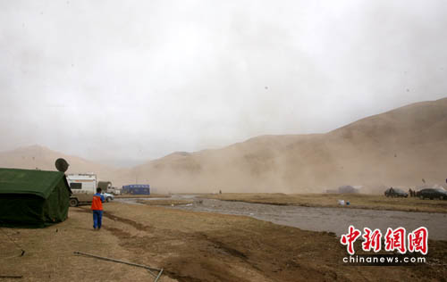地震發(fā)生后,玉樹惡劣天氣頻頻出現(xiàn),幾乎天天都要出現(xiàn)沙塵暴。記者來到災(zāi)區(qū)后,第一感覺就是這里風(fēng)沙大,一天要刮幾次大風(fēng)。風(fēng)沙吹在的人眼睛都睜不開,災(zāi)民安置區(qū)內(nèi)天昏地暗,居住的帳篷內(nèi)床上,吃飯的碗,臉盆里,電腦上都是灰塵。