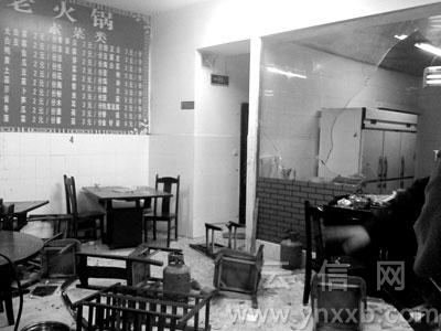 “砸!”一聲“令”下,幾十人拿著砍刀和鋼管,在火鍋店就開始到處亂砍!班枥锱纠病被疱伒甑牟AТ胺鬯樾缘袈,啤酒瓶、餐具接二連三被砸碎,正在沸騰的火鍋被掀翻在地,墻上、地上灑滿紅油。頓時店里一片混亂,客人、服務(wù)員紛紛沖進廚房躲避。