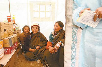 看一看玉樹街頭的人們,你會五味雜陳。傷感無處不在:小學生的校服和紅領(lǐng)巾上沾著灰,好像是剛從倒塌的校舍里拋出來的一樣;9歲的孩子抱著爛了一半的梨子不肯撒手;革及著拖鞋的外地女人失神地站在消失了的貨棧面前。但也有些時候,能遇上剛領(lǐng)了一把掛面的女孩笑呵呵地露出白色牙齒,或是孩子在蓬頭垢面的母親懷里安睡。一個孤獨的老婦人牽著一條狗,面色平靜地坐在倒掉的院墻邊上,讓人不禁想起“家園”和“守候”這些詞匯。