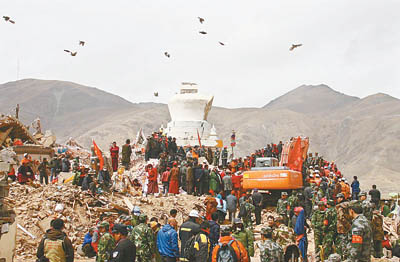 愿意在風雪中進行一次短暫巡視的人到處都能看到這樣的景象:騎著缺了車燈的摩托車的藏族漢子一臉倦容,他怕家人牽掛而備感焦急,但還是會對外來的人擠出一絲微笑;5個年輕人——他們有的還只是高中生——正忙著把自家的廢墟扒開,搬出椅子、飯鍋或者其他可能還完整的東西。很難知道家里的大人在哪里,問起來,他們轉(zhuǎn)過頭去,一臉茫然的神情。