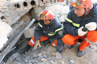 國家救援隊(duì)在到達(dá)玉樹機(jī)場后,救援隊(duì)員火速前往受災(zāi)最重的玉樹縣城結(jié)古鎮(zhèn)。全體救援隊(duì)員挑燈夜戰(zhàn),齊心協(xié)力營救出2名幸存者。雖初戰(zhàn)告捷,但救援隊(duì)員不敢絲毫松懈,因?yàn)閺U墟還有更多生命等待我們。只要有一線希望,我們就會盡百倍努力,“不拋棄,不放棄”。