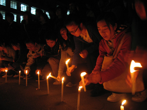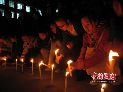 中新網(wǎng)烏魯木齊4月22日電(冀江彤)21號(hào)晚間10時(shí),新疆大學(xué)近3000名學(xué)子,點(diǎn)燃燭光,俯首致哀,表達(dá)對(duì)玉樹(shù)地震遇難者的哀思;顒(dòng)結(jié)束后,仍有許多學(xué)生手捧燭光,不愿離去,為玉樹(shù)人民祈福加油。