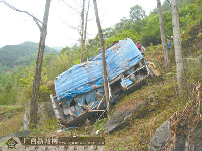 東蘭訊 4月22日上午9時(shí)許,一輛由大化瑤族自治縣七百弄鄉(xiāng)開(kāi)往河池市的客運(yùn)中巴車,在途經(jīng)東蘭縣花香鄉(xiāng)干來(lái)村時(shí)突發(fā)機(jī)械故障,導(dǎo)致車輛滾下90米長(zhǎng)陡坡(垂直高度40米)。事故造成車上7名乘客先后死亡,35人不同程度受傷。