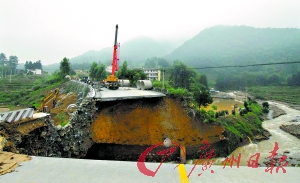 本報韶關訊(記者卜瑜 通訊員賴志坡、蔡明清攝影報道) 位于乳源境內(nèi)的國道323線K426+360處大型涵洞被洪水沖毀。路面出現(xiàn)深達14.5米的大洞(如圖),被毀路基長90米、路面面積1000平方米,交通中斷。韶關市政府昨天調(diào)集100多名工人和10多臺大型機械日夜搶修,有望今天恢復通行。