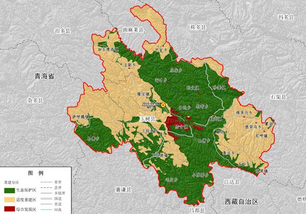 災(zāi)后恢復(fù)重建要與三江源、隆寶自然保護(hù)區(qū)規(guī)劃相銜接,根據(jù)資源環(huán)境承載能力綜合評(píng)價(jià),將規(guī)劃區(qū)國(guó)土空間劃分為生態(tài)保護(hù)區(qū)、適度重建區(qū)和綜合發(fā)展區(qū)。