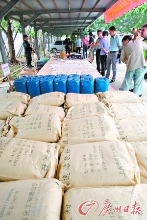 4月23日凌晨4時(shí)許,專案組在廣州市某住宅區(qū)抓獲潘某斌的妻子,犯罪嫌疑人梁某寧,當(dāng)場繳獲毒品K粉52千克、麻古32千克、冰毒8千克。當(dāng)天上午9時(shí)許,專案組找到了該團(tuán)伙在沙田鎮(zhèn)一廢棄倉庫內(nèi)的制毒工場,繳獲丙酮、氫氧化鈉等大批化工原料和大批制毒工具。