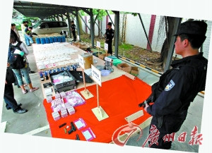 4月22日,東莞市公安局在省公安廳統(tǒng)一指揮和陜西警方的支持下,破獲“330A”特大武裝制販毒案件,抓獲潘某斌等犯罪嫌疑人15名,搗毀制毒工場1個(gè),繳獲K粉約246千克、冰毒約8千克、麻古約33千克、制毒原料羥亞胺1025千克,查獲美式制式手槍和仿64手槍各1支、子彈31發(fā),扣押毒資人民幣250多萬元,作案車4輛。