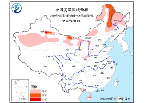 中新網(wǎng)6月24日電 中央氣象臺(tái)6月24日06時(shí)繼續(xù)發(fā)布高溫藍(lán)色預(yù)警:預(yù)計(jì),今天白天,甘肅西部、寧夏北部、內(nèi)蒙古大部、黑龍江大部、吉林西部、山西西南部、陜西關(guān)中地區(qū)、廣東雷州半島、廣西西南部的局部地區(qū)、海南中北部等地有35~37℃的高溫天氣,其中,內(nèi)蒙古西部的局部地區(qū)最高氣溫可達(dá)40~41℃。