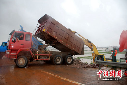現(xiàn)場(chǎng)已有數(shù)十輛大型運(yùn)輸車(chē)滿(mǎn)載石料排列在高速路邊,排隊(duì)傾瀉石料,數(shù)臺(tái)工程挖掘車(chē)、推出機(jī)分頭迅速將成堆石料往外推,一個(gè)“路頭”已經(jīng)形成。