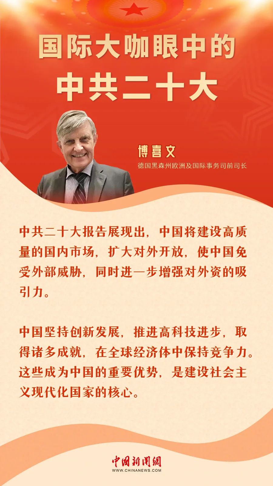 國際輿論表示中共二十大擘畫中國未來發(fā)展藍(lán)圖,為今后發(fā)展指明道路,為現(xiàn)代化建設(shè)奠定基礎(chǔ),并評論稱中國一定能實(shí)現(xiàn)奮斗目標(biāo)。