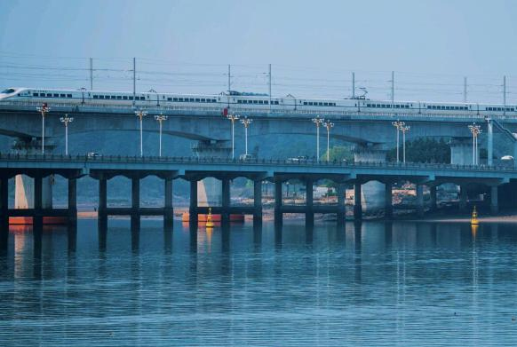 在城市的鋼鐵森林中,高鐵列車宛如一條靈動(dòng)的銀蛇。它穿梭在高樓大廈之間,與城市的繁華完美相融。(投稿:潘宇)