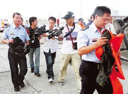 飛機(jī)失蹤后,臺(tái)空軍全力搜救,直升機(jī)首先在貓嶼北方0.6海里處發(fā)現(xiàn)大范圍不明油污,巡防艇又在該處尋獲印有“雙前”編號(hào)15211的鋁合金傘箱,內(nèi)置的橘色飛行傘已脫離,傘廂破裂變形。此后,搜救隊(duì)在貓嶼1海里處再尋獲自動(dòng)救生背心及外覆外包,救生背心上寫著編號(hào)OC○○1,救生衣無明顯損壞。