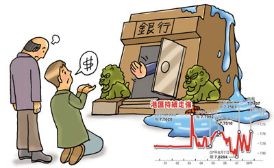 銀行“水浸”卻未能令拆息回落,3個月拆息仍高漲在2厘水平。金管局發(fā)言人表示,由于美元長倉平盤令港元匯價偏強,令該局被動沽出港元。雖然港匯持續(xù)強勢,但強調(diào)現(xiàn)行聯(lián)匯制度行的有效,無意改變目前的兌換范圍,或擴大兌換的浮動區(qū)間。