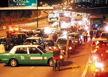 到晚上10時許,有10多輛新界的士更在東涌映灣園對面的北大嶼山公路堵塞道路,令往九龍方向交通癱瘓,車龍長達(dá)1公里,龍尾一度延伸至國泰城。
