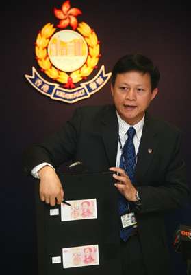 商業(yè)罪案調查科數字顯示,去年檢獲逾萬張假人民幣中,83%為假100元,數量為8500多張,50元和20元檢獲近1400張,而HD90字頭則占總數29.2%。商業(yè)罪案調查科專家及支援小組署理總督察阮錦亮說,檢獲的假人民幣并非高質素偽鈔,90%為柯式印刷,10%是數碼打印,質素屬一般或差劣,無證據顯示香港的兌換店成為偽鈔分銷點。