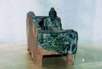 1、床:該床尺寸:長20.5cm,高:14cm,寬:12cm。從造型看漢代床的特征極為明顯。該床由三部分組成:床板,邊框,支架。該床為厚板與邊框護(hù)板相連。床面上刻有幾何形方格紋,又稱錢眼紋,泉源紋,即,古銅錢中心方孔紋飾。寓意睡臥錢眼,后輩有錢。床上邊框為左、后、右三面高護(hù)板組成。后護(hù)板中高、兩低。每塊護(hù)板上模印草花。寓意草繁茂盛。床板與邊框護(hù)板相連放在四腿支架上。四腿支架前后又有護(hù)板。前護(hù)板上三個方格內(nèi)有卷草模印圖案,后護(hù)板無釉無紋為黃泥土胎。