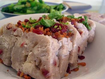 4、把香腸芋頭丁鋪一層在蛋糕模底層,再把打好的米漿搖晃均勻,倒在模具里,再在上面撒一層香腸芋頭丁;