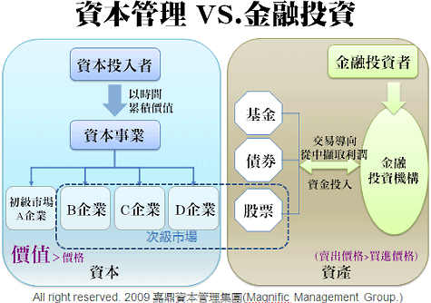 資本管理則是截然不同的取向。資本管理的焦點(diǎn),在于“事業(yè)”(或是企業(yè))上,資本投入者的眼光和視野,完全著重在:“這個(gè)企業(yè)容易理解嗎”、“我能否掌握它的長(zhǎng)期經(jīng)濟(jì)特質(zhì)”、“管解階層正直可信嗎”,并透過(guò)合理價(jià)格,取得企業(yè)一部分的未來(lái)。