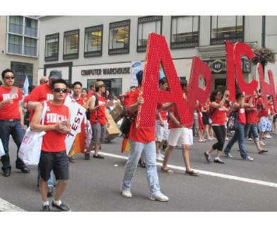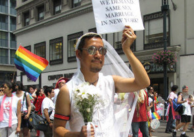 亞裔隊伍由巨大的彩虹字幅“Asian Pride”打頭陣,數(shù)十人演奏亞洲樂器,吸引民眾注意力,緊隨其后的是專門為亞裔女同志設(shè)立的Q-Wave團體!皝喬岚滩÷(lián)盟”(APICHA)主打“免費HIV檢測”計劃,近百位身穿紅色T恤的成員們手舉標語,向沿路民眾分發(fā)安全套。很多亞裔同志勇敢展示自己,其中不乏華裔身影。一位身穿結(jié)婚禮服的亞裔男同志,手舉“要求紐約承認同性婚姻”的牌子,表達了同志們的呼聲。也有不少同志的支持者參加游行,梁淑儀支持身為女同志的姐姐梁淑安一起來游行,當(dāng)義工的劉健行和劉素夫婦表示有很多同志朋友,大家都是一樣的人,沒有什么不同。(劉爽)