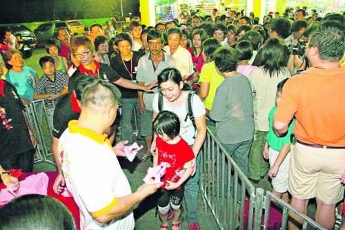 當晚,檳州首長林冠英偕夫人及孩子在7時35分抵步,在大山腳民眾陪同下,切下全馬最大月餅“月光寶盒”,原來月餅內(nèi)藏有一個寶盒寫著“恭賀各界中秋節(jié)快樂”。