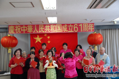 東京各界華僑和應(yīng)邀前來參加活動的日中友好會館、在日朝鮮人總聯(lián)合會、在日大韓民國民團(tuán)、日本新華僑華人會、在日中國企業(yè)協(xié)會、日本中華總商會、橫浜華僑總會、長野華僑總會等團(tuán)體在中華人民共和國61年國慶前夕齊聚一堂,華人華僑的愛國思鄉(xiāng)之情涌上心頭。席間,東京華僑婦女會會長吳少煖帶領(lǐng)婦女會員們?yōu)榇髸I(xiàn)唱一曲《五星紅旗》,不僅抒發(fā)了大家思念之情,更激發(fā)了眾人的愛國激情。吳少煖包含激情地表示:“我們獨在異鄉(xiāng)為異客,每逢佳節(jié)倍思親。雖然身在異鄉(xiāng),但是思念祖國的心是一直沒有改變過的。望祖國今后更加繁榮富強!