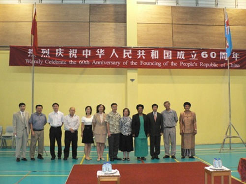 中新網(wǎng)9月24日電 據(jù)中國駐斐濟(jì)大使館消息,9月18日,由在斐華人創(chuàng)辦和管理的斐濟(jì)名!菹蓪W(xué)校舉辦慶祝中華人民共和國成立60周年升旗儀式和文藝活動,韓志強(qiáng)大使應(yīng)邀出席并講話。斐華人教育協(xié)會會長余倩莊、逸仙學(xué)校中小學(xué)師生代表700余人參加!