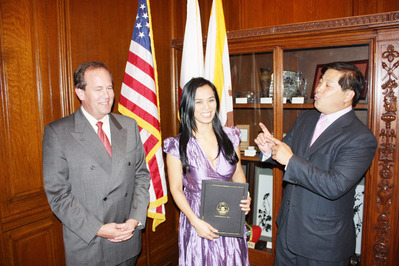 21日在市長(zhǎng)辦公室國(guó)際廳代表舊金山接待韋唯的是市長(zhǎng)辦公室國(guó)際貿(mào)易主任錢德勒 (Mark Chandler) 和灣區(qū)捷運(yùn)董事方以偉。錢德勒表示,舊金山市府沒有頒發(fā)“榮譽(yù)市民”的慣例。市長(zhǎng)紐森簽署的榮譽(yù)狀 (Certificate of Honor)就是對(duì)來訪者致敬的方式。紐森在榮譽(yù)狀上贊揚(yáng)韋唯對(duì)美中兩國(guó)友好關(guān)系的貢獻(xiàn),并對(duì)她來舊金山參加“同一首歌”表示榮幸。
