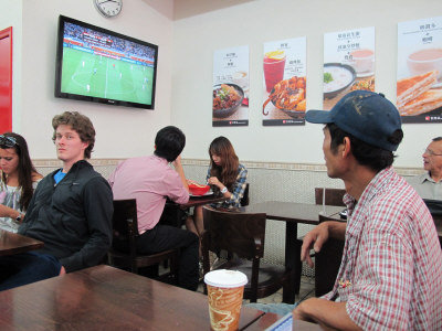不少球迷早已準備好享受這場足球盛宴,據(jù)美國《星島日報》報道,紐約下東城不少酒吧、餐廳甚至小區(qū)團體早已準備了看球場地,以吸引顧客。華埠地威臣街“香港站”快餐店門外的大餐牌早早的就換成世界杯賽事的中英文海報和賽程細表,店內兩部寬屏的液晶電視,輪流播著不同體育節(jié)目。