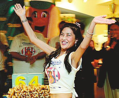 看過李蕙比賽的人都難以理解:她五尺出頭、腰細得只能穿零號牛仔褲的小女子,怎么能和那些五大三粗的猛男們競爭大胃王的寶座?不論是連續(xù)兩年在紐約著名的國慶節(jié)吃熱狗大賽中,還是在各地的競吃賽場,觀眾們對參賽的大漢們興趣平平,但對身穿露肚臍短款T恤、腰間沒有半點松皮和贅肉的44歲辣媽卻情有獨鐘,都爭先恐后與她拍照留念。