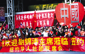 9月21日,中國國家主席胡錦濤抵達紐約出席聯(lián)合國峰會,美國東部地區(qū)3000華人華僑聚集在紐約曼哈頓華爾道夫酒店附近,熱烈歡迎。歡迎人群來自紐約、新州、賓州、康州等地,大紐約地區(qū)各大高校也組織了上千留學(xué)生前往歡迎,F(xiàn)場有鮮艷的國旗及醒目多樣的歡迎標(biāo)語,歌聲雷動、歡呼聲不斷!稅畚抑腥A》、《大中國》、《歌唱祖國》等歌曲回蕩在曼哈頓上空。不少歡迎者更是興奮地跳起了舞,歡迎遠方的貴客。歡迎人群中年齡最小只有10個月大,最大的已經(jīng)80多歲。中國駐美大使周文重代表胡錦濤向歡迎隊伍,以及美國的所有華人表示感謝。