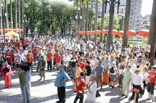 6日上午,圣保羅市中心SE 廣場(chǎng)四周懸掛數(shù)十個(gè)巨型大紅燈籠,古老的大教堂前臨時(shí)搭起了舞臺(tái),臺(tái)上貼有中國(guó)春聯(lián)掛有中國(guó)結(jié)等節(jié)日吉祥物,組合音響播放著喜慶的中國(guó)民樂(lè),廣場(chǎng)一側(cè)設(shè)有中國(guó)文化藝術(shù)攤位,廣場(chǎng)上一派節(jié)日的歡快喜慶景象。