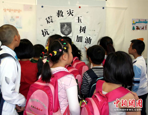 周六下午,是孩子們常規(guī)上中文課的時(shí)間。下課的鈴聲一響,孩子們就把自己的零用錢裝進(jìn)信封,一個(gè)接一個(gè)地放進(jìn)捐款箱,然后在寫著"抗震救災(zāi) 玉樹加油"的橫幅上寫下自己的名字,有些會(huì)寫中文的孩子還寫上了“加油”二字。一筆筆稚嫩的筆跡代表著一份份純真的愛心。