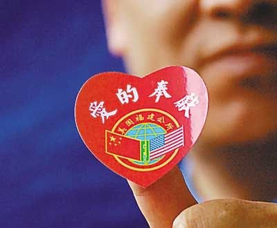 福建公所主席鄭時甘在東百老匯的募捐攤位上向每位捐款的民眾贈送一張印有“愛的奉獻”字樣和福建公所標志的紅色心型貼紙,一方面表示對捐款者的感謝,一方面希望僑胞能將貼紙傳遞給更多華人,使更多民眾為青海災區(qū)獻上愛心。
