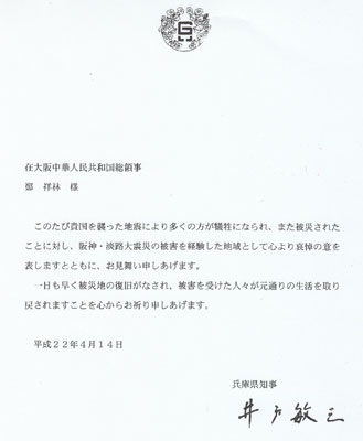 兵庫縣知事井戶敏三在慰問電中說:“獲悉貴國發(fā)生了不幸的地震導(dǎo)致很多人民犧牲,作為有經(jīng)歷過阪神淡路大震災(zāi)的地區(qū)兵庫縣,我們對受災(zāi)者表示由衷的哀悼和深刻的慰問。我們祈禱災(zāi)區(qū)早日恢復(fù)正常,從心里祝愿地震受害者早日康復(fù)!