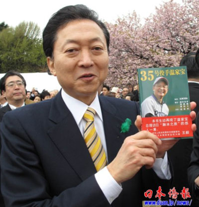 在“賞櫻會(huì)”上,受邀參加的日本僑報(bào)社張景子社長向鳩山首相贈(zèng)送了該社出版的《35號投手溫家寶》,鳩山首相欣然收下,并勉勵(lì)日本僑報(bào)社繼續(xù)為日中交流做貢獻(xiàn)。張景子說,“我們來自中國,在日本創(chuàng)辦的日本僑報(bào)出版社致力于日中交流,已經(jīng)出版了200來本書。2008年出版了中日文版《35號投手溫家寶》,今天特地給您帶來了一本!兵F山首相高興地從張景子手中接過《35號投手溫家寶》一書,仔細(xì)端詳,并說:“我下個(gè)月就要與溫家寶總理會(huì)面。希望你們繼續(xù)努力,為促進(jìn)日中交流作出更大的貢獻(xiàn)!闭f完,鳩山首相高高地舉起《35號投手溫家寶》一書,讓大家拍照。