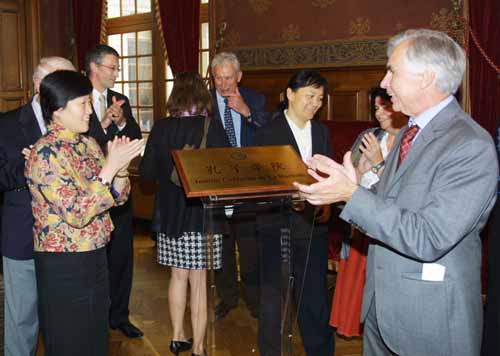 為了表現(xiàn)該城對建立孔子學(xué)院的重視,掛牌儀式特別移到拉羅舍爾德市政府大廳舉行。市政廳也是一處歷史古跡,火焰哥特式圍墻包圍著文藝復(fù)興風(fēng)格的建筑主體。特別顯眼的是市政府特意在大門口的歐盟旗和法國國旗旁邊掛上了鮮艷的五星紅旗。為了讓儀式隆重?zé)崃,除了普瓦圖-夏朗德大區(qū)議會與拉羅舍爾市地一干政要及嘉賓外,市長馬科斯穆•布諾特別邀請了社會各界人士以及當(dāng)?shù)氐娜A僑華人和留學(xué)生等約200人出席當(dāng)天的活動,把個節(jié)日大廳擠得滿滿的。